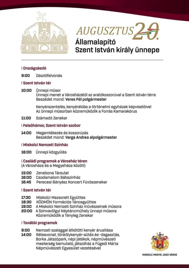 - A Szent István téren 17:30-tól folytatódnak a programok a Miskolci Mazsorett Együttes fellépésével, majd 18:30-tól a KÖDMÖN Formációs Táncegyüttes, 19:00 órától a Miskolci Nemzeti Színház művészeinek műsora, 20:00-tól pedig a Szinvavölgyi Néptáncműhely ünnepi műsora várja az érdeklődőket, közreműködik a Tényleg Zenekar.