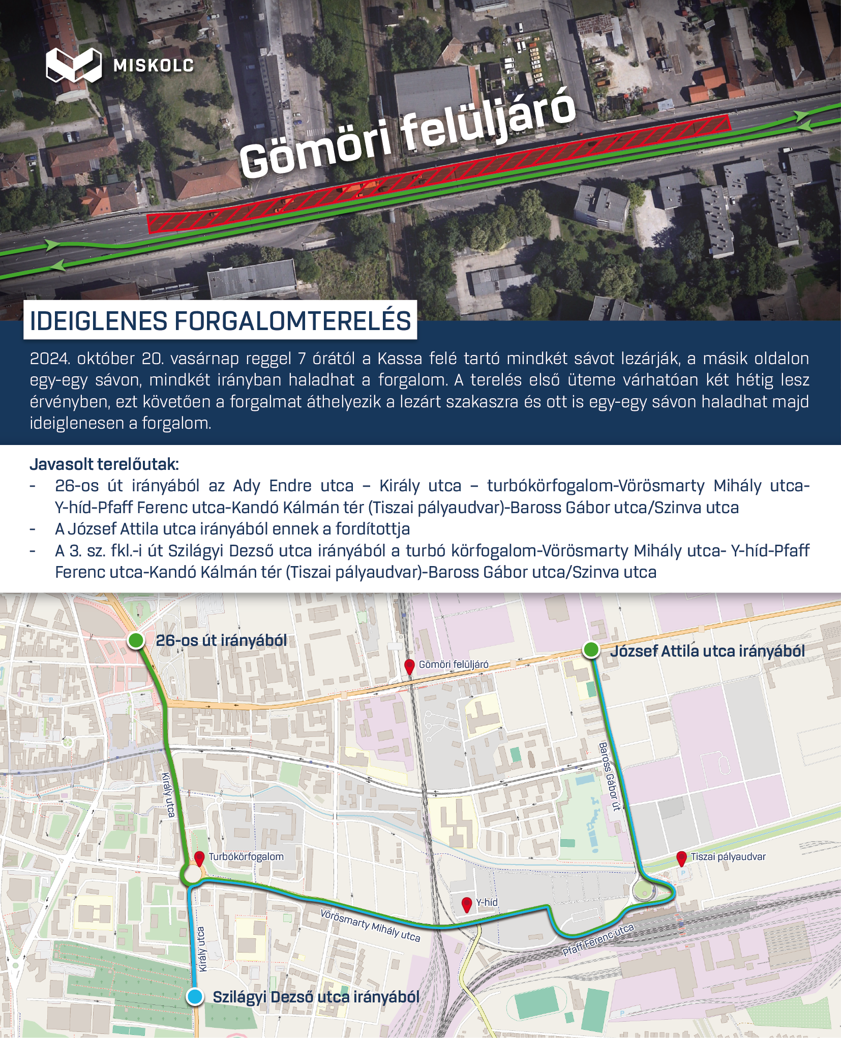 - A 3. sz. fő közlekedési út Szilágyi Dezső utca irányából a turbókörfogalom - Vörösmarty Mihály utca - Y-híd-Pfaff Ferenc utca-Kandó Kálmán tér (Tiszai pályaudvar)-Baross Gábor utca/Szinva utca