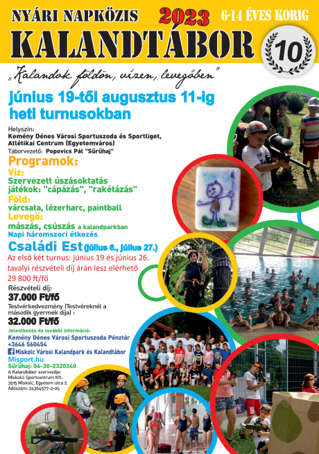 A Miskolci Sportcentrum Kft. tájékoztatja a Tisztelt Szülőket, hogy idén nyáron már 10. alkalommal kerül megrendezésre a Kalandtábor elnevezésű nyári napközis tábor.