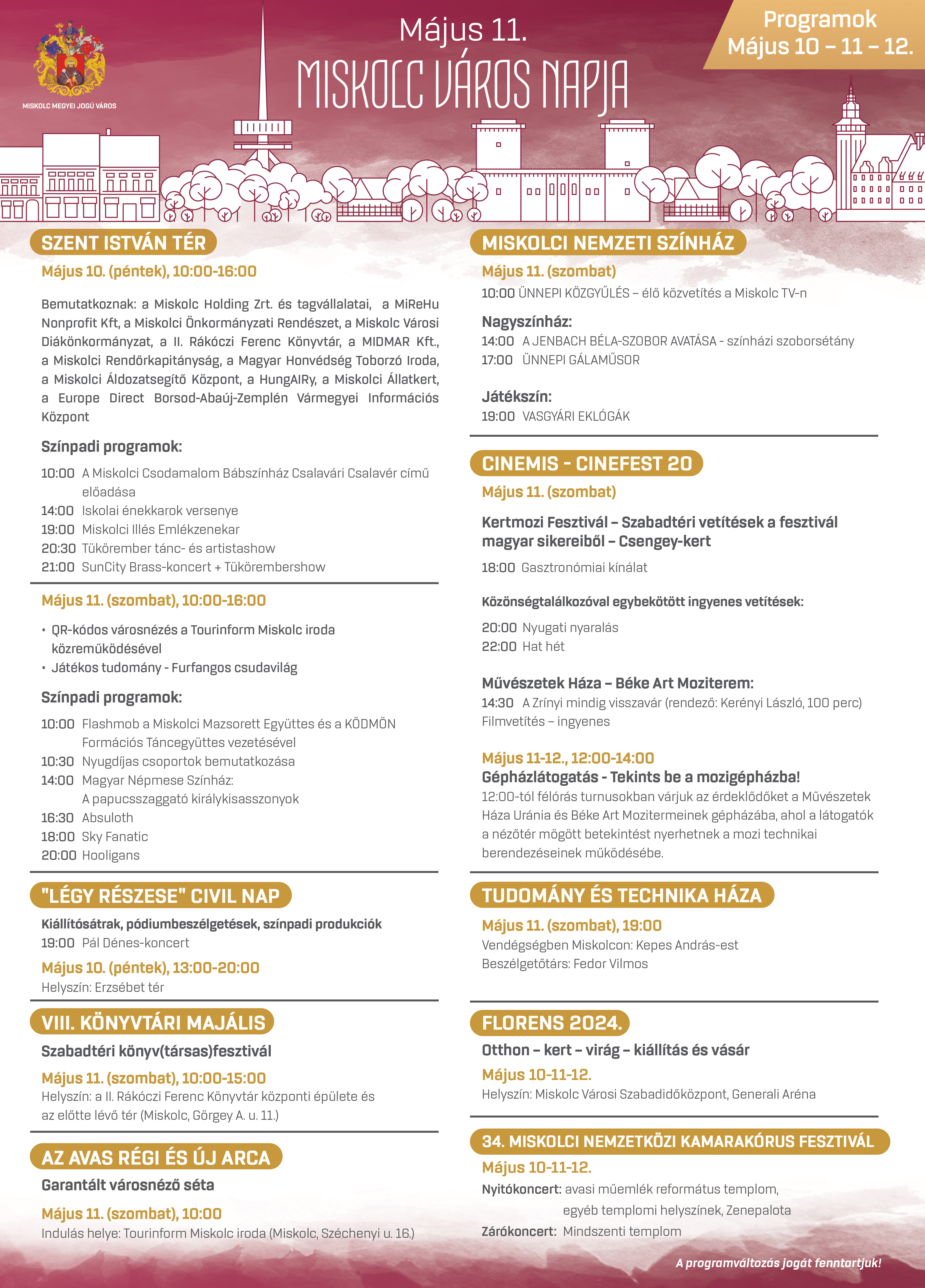 Miskolc idén egy egész hétvégényi programmal készül a város napjára. Május 10-én, 11-én és 12-én a Szent István és az Erzsébet téren, a II. Rákóczi Ferenc Megyei és Városi Könyvtárban, a Miskolci Nemzeti Színház szoborparkjában, a Csengey-kertben, a Művészetek Házában, a Tudomány és Technika Házában, a Miskolc Városi Szabadidőközpont – Generali Arénában, az Avasi református műemléktemplomban, a Zenepalotában és a Mindszenti templomban várják majd az érdeklődőket különböző rendezvényekkel a szervezők. A programok részletes listája a levélhez csatolt plakáton, illetve az alábbi linkre kattintva olvasható.