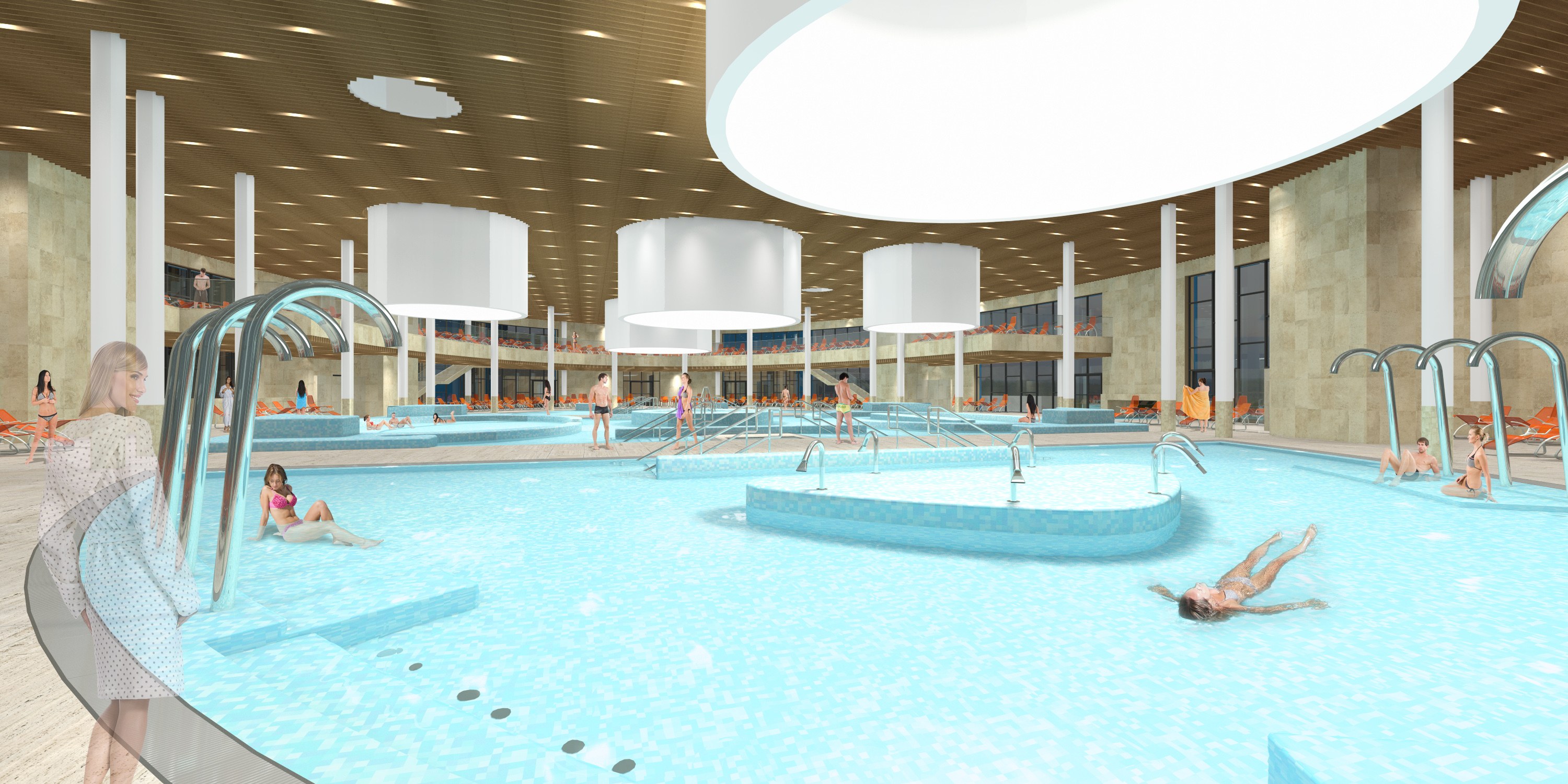 A futurisztikus fürdőkomplexumban 8 beltéri és 2 kültéri medencét álmodtak meg a tervezők. Az új létesítmény szerves egységet alkot majd a strandfürdő 2015-ben átadott első ütemével.