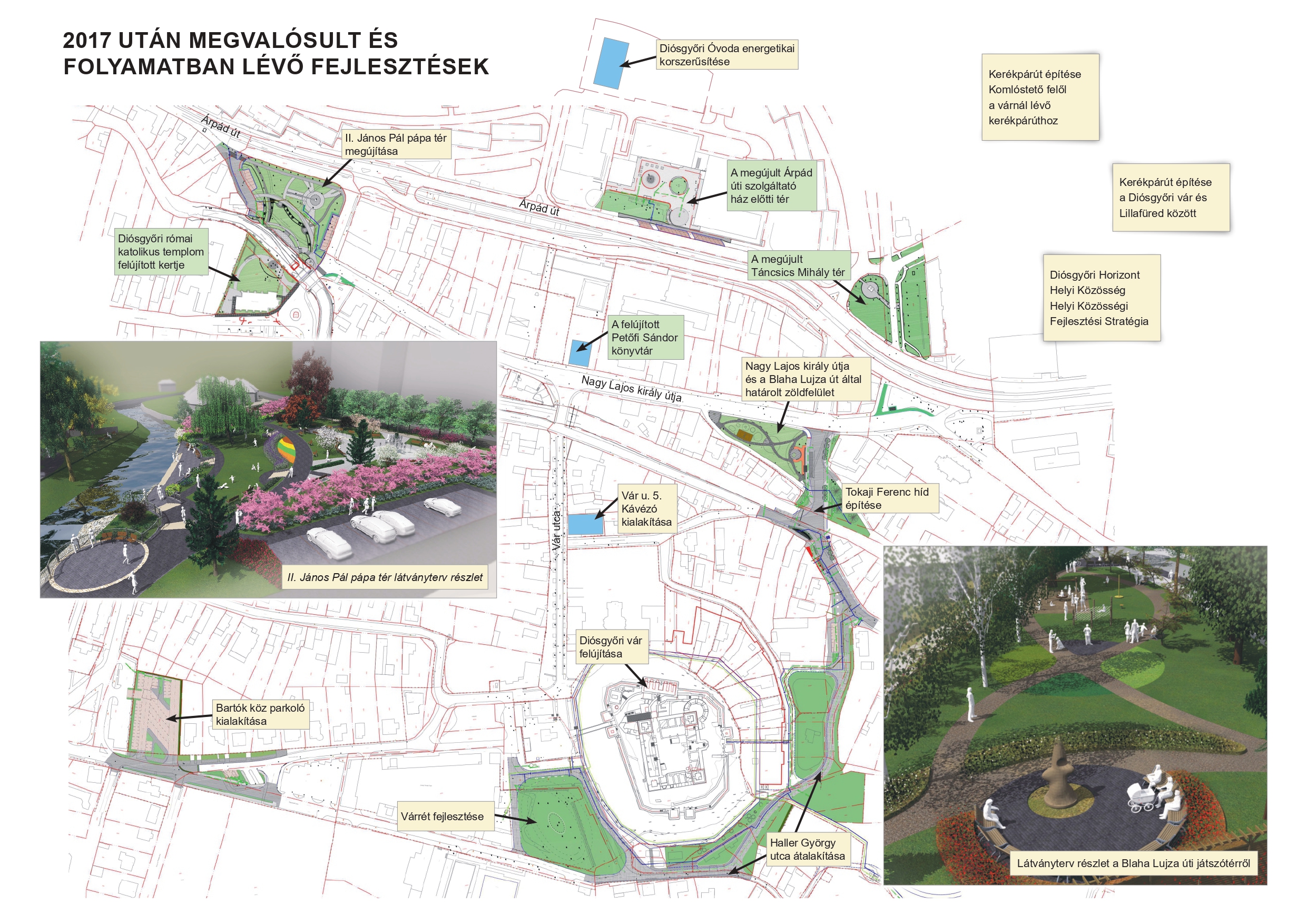 A diósgyőri fejlesztések során a miskolci önkormányzat rendbe tette a Szinva patak medrét, amely így biztonságosan vezeti le az árhullámot; több orvosi rendelőt, bölcsődét, óvodát felújított; megújult a diósgyőri városi uszoda; újjáépítették a Bagolyvárat, amely a városrész ikonikus épülete volt, ma a villamosközlekedés felső-majláthi végállomása; megszépült a lillafüredi függőkert; megépült a Lovagi Tornák Tere, megvalósult a Diósgyőri vár első ütemének fejlesztése; újjáépült a DVTK otthona, a Diósgyőri stadion, amely a 2018-ban átadott arénák között a legszebb – a felsorolás kiegészíthető, de ennyi is jól mutatja a városrész elmúlt 10 éves fejlődését, fejlesztését, amely 2017-ben a Diósgyőr városközpont integrált rehabilitációja pályázatból folytatódott. Ekkor az önkormányzat felújította a Petőfi Sándor Fiókkönyvtárat és a Diósgyőri Római Katolikus Plébániával együtt a templomkertet.