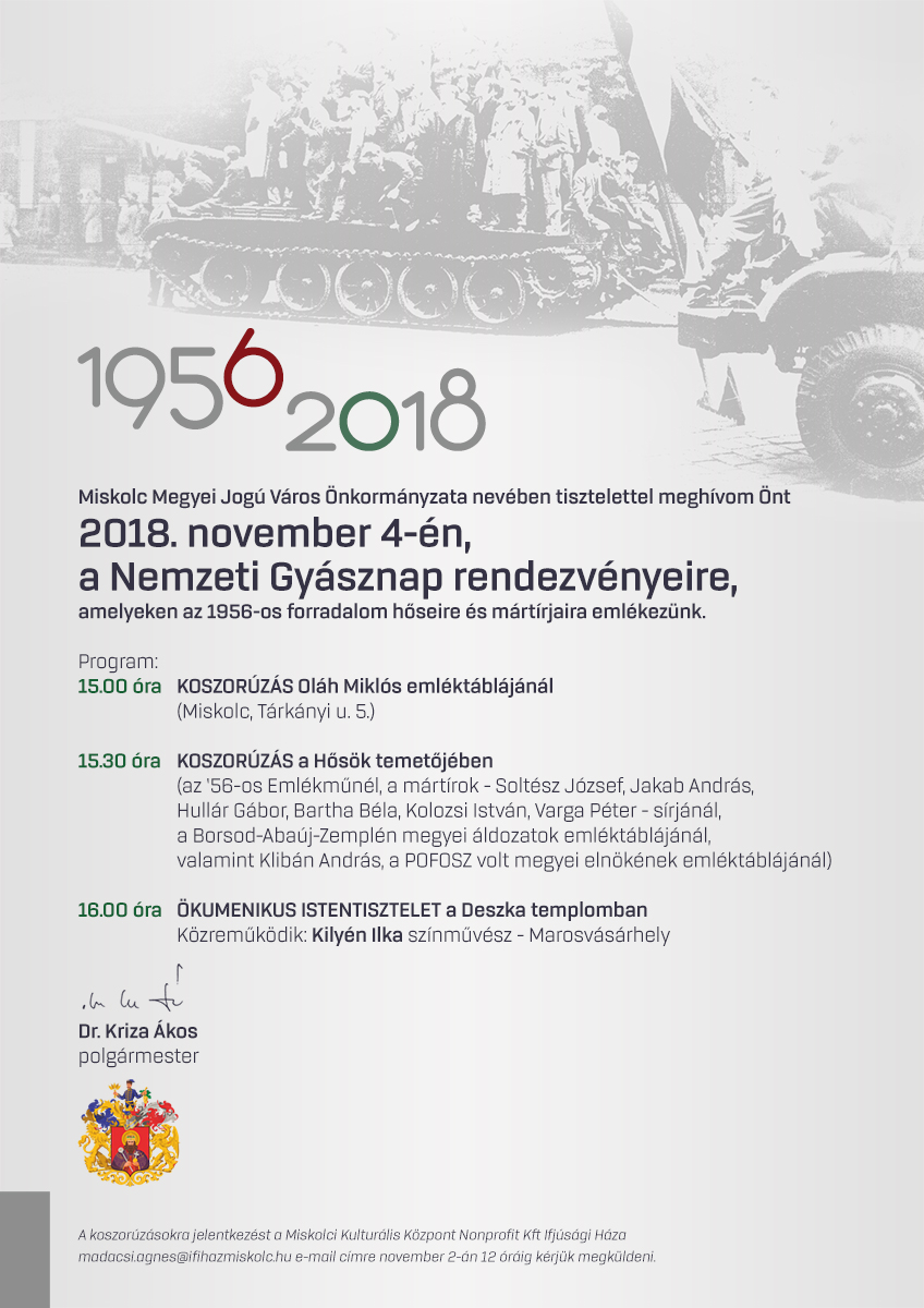 Miskolc Megyei Jogú Város Önkormányzata a Nemzeti Gyásznap alkalmából 2018. november 4-én (vasárnap) megemlékezést tart az 1956-os forradalom hőseiről és mártírjairól.