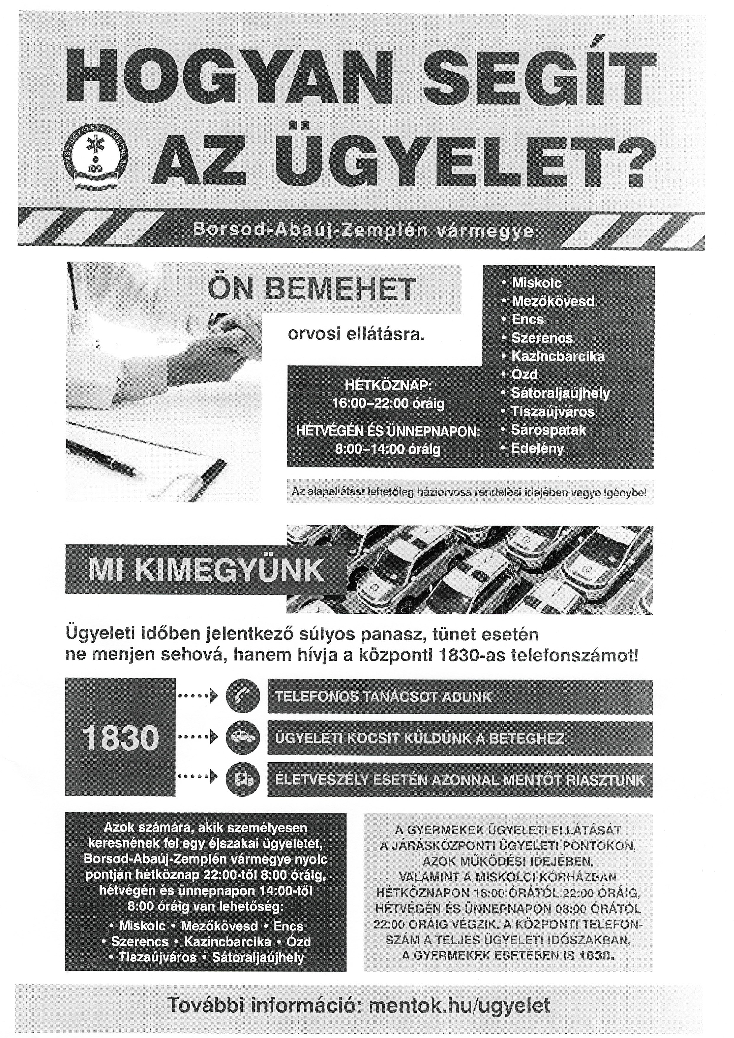 Az ügyeleti alapellátást 2023. április 1-től Borsod-Abaúj-Zemplén vármegyében is az Országos Mentőszolgálat látja el, majd az egységes, két elemből álló, betegközpontú rendszert (háziorvosi ügyeleti ellátás és sürgősségi ügyelet) az idei év végéig fokozatosan bevezetve az ország egész területén biztosítják minden rászoruló számára.
