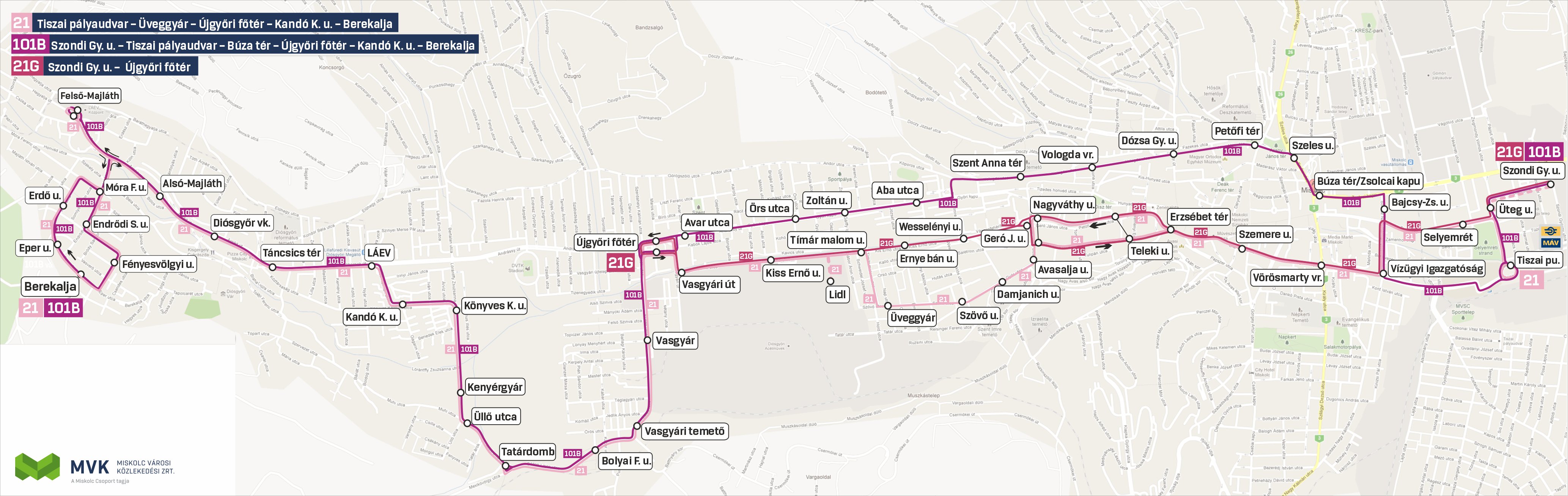 - a Tiszai pályaudvar – Újgyőri főtér szakaszon közlekedők a 101B-s autóbuszok mellett az 1-es, 21-es, és 21G-s járatokat is igénybe vehetik utazásukhoz;