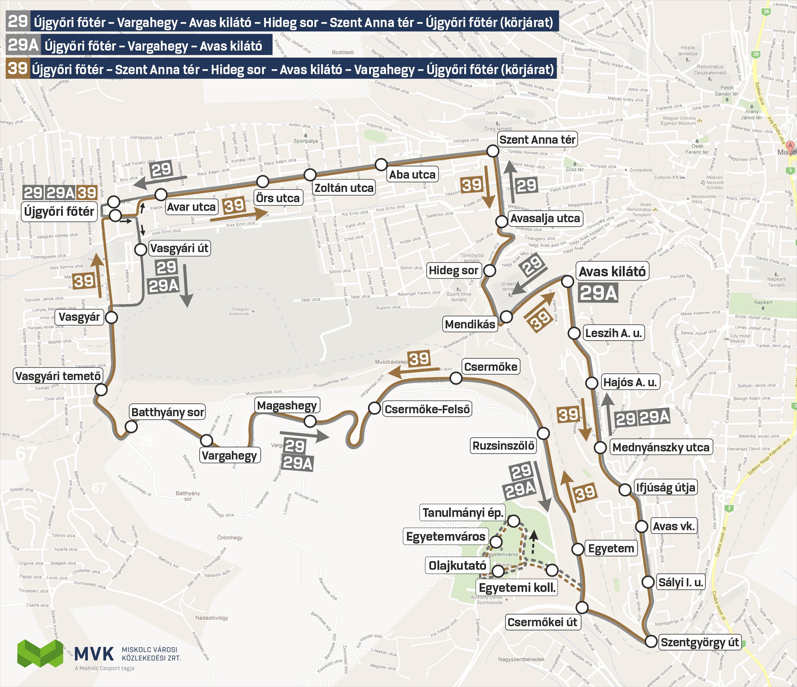 A 29-es busz meghosszabbított útvonalon, az Avas kilátótól a Hideg soron és a Győri kapun keresztül az Újgyőri főtérig körjáratként közlekedik, fordított irányban pedig 39-es jelzéssel. Ezáltal újra lesz közlekedés a Hideg soron és az Avas jelentős részéről átszállásmentesen elérhetővé válnak a Nagyváthy utca környékén található iskolák, valamint a Győri kapuból az avasi középiskolák is.
