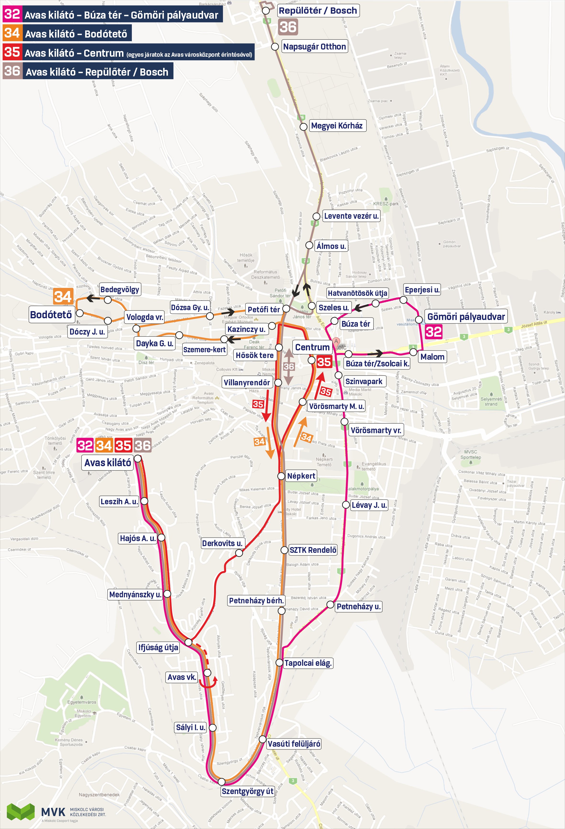 - a 35R-es járatok 36-os viszonylatjelzéssel közlekednek majd (változás még, hogy az Avas kilátó végállomáson nem a korábban megszokott indulóhelyen, hanem a 32-34-es autóbuszok indulóállásán lehet igénybe venni).