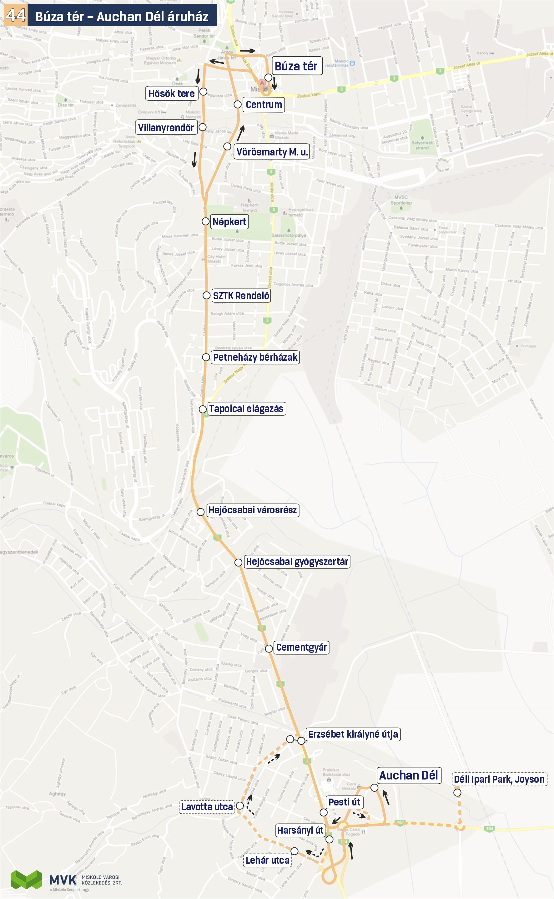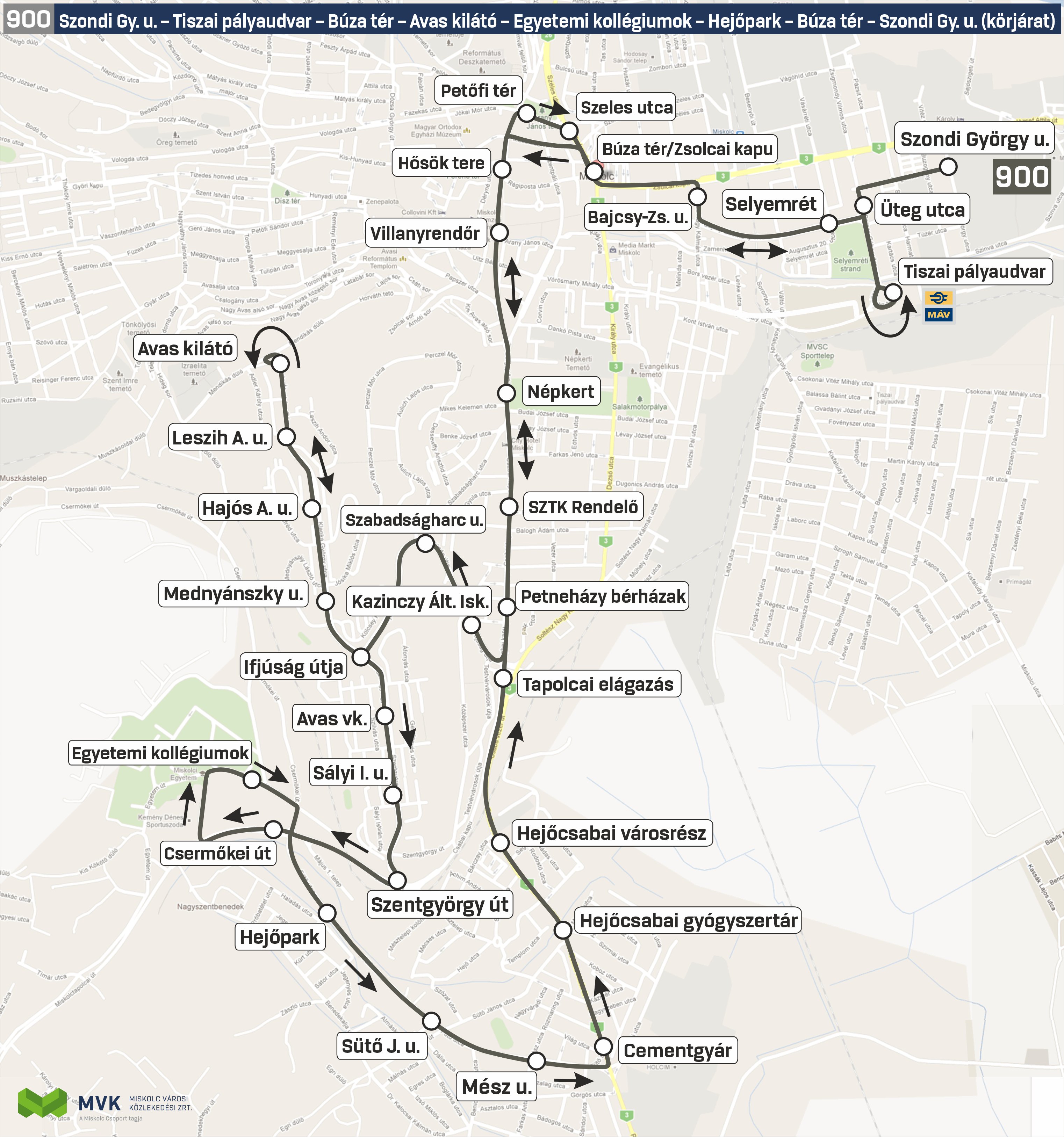 - 900-as éjszakai körjárat, amely a Szondi György utca – Tiszai pályaudvar – Búza tér / Zsolcai kapu – Villanyrendőr – SZTK Rendelő – Szabadságharc utca – Avas kilátó – Avas városközpont – Egyetemi kollégiumok – Hejőpark – Cementgyár – Tapolcai elágazás – Villanyrendőr – Búza tér / Zsolcai kapu – Szondi György utca útvonalon közlekedik majd;