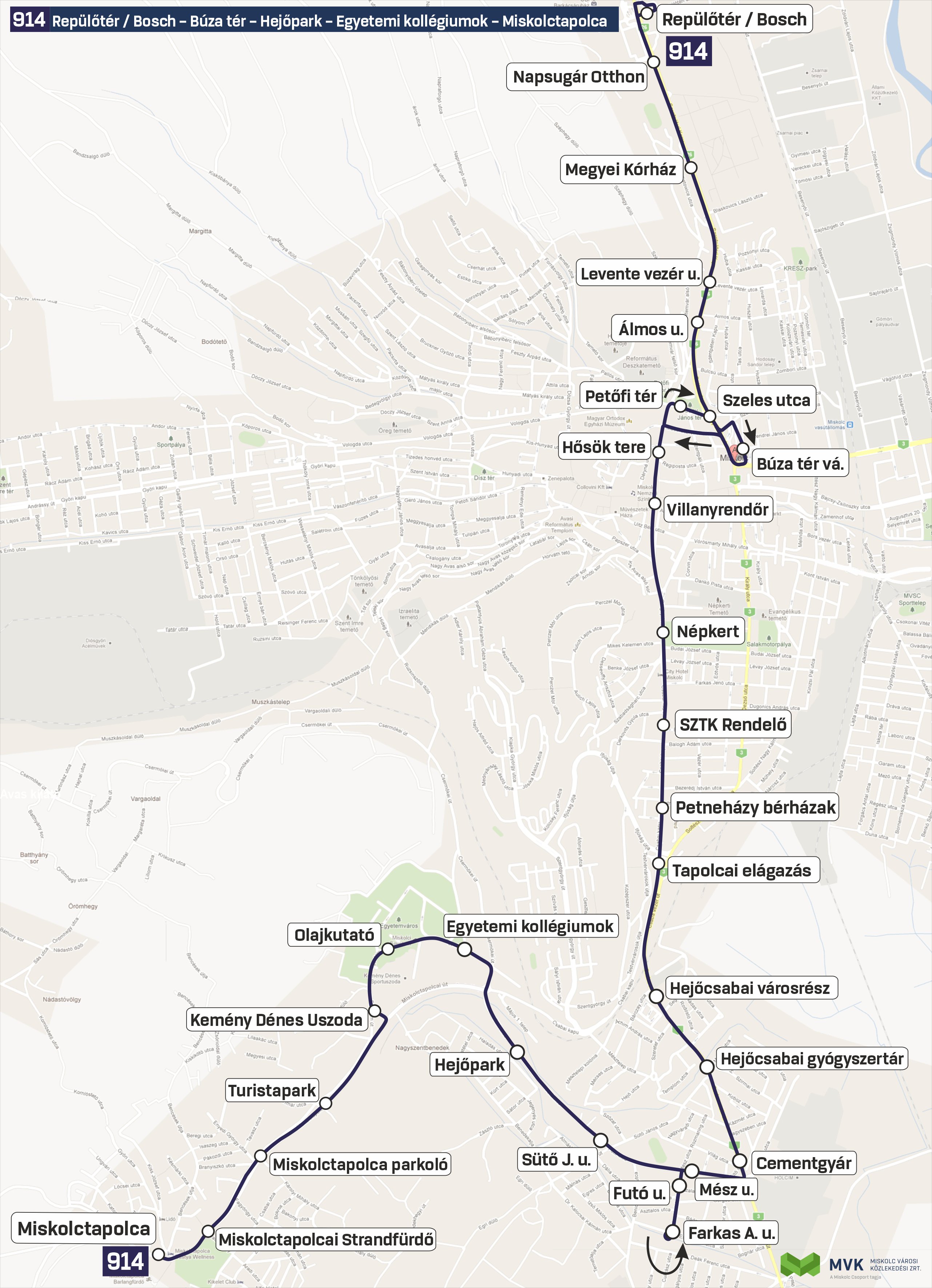 - 914-es viszonylat, amely a Repülőtér/Bosch végállomás – Búza tér - Villanyrendőr – Hejőpark - Egyetemi kollégiumok – Miskolctapolca útvonalon közlekedik hajnalban és éjszaka.