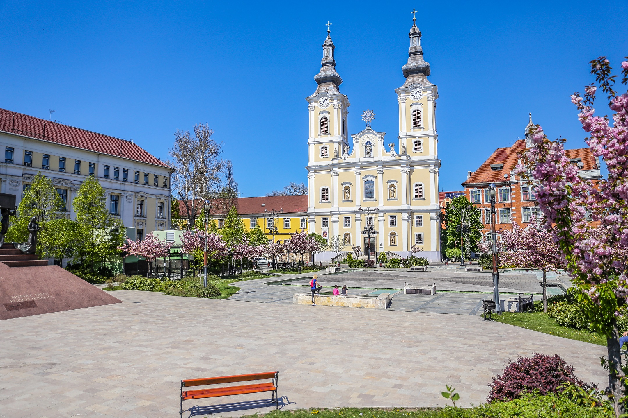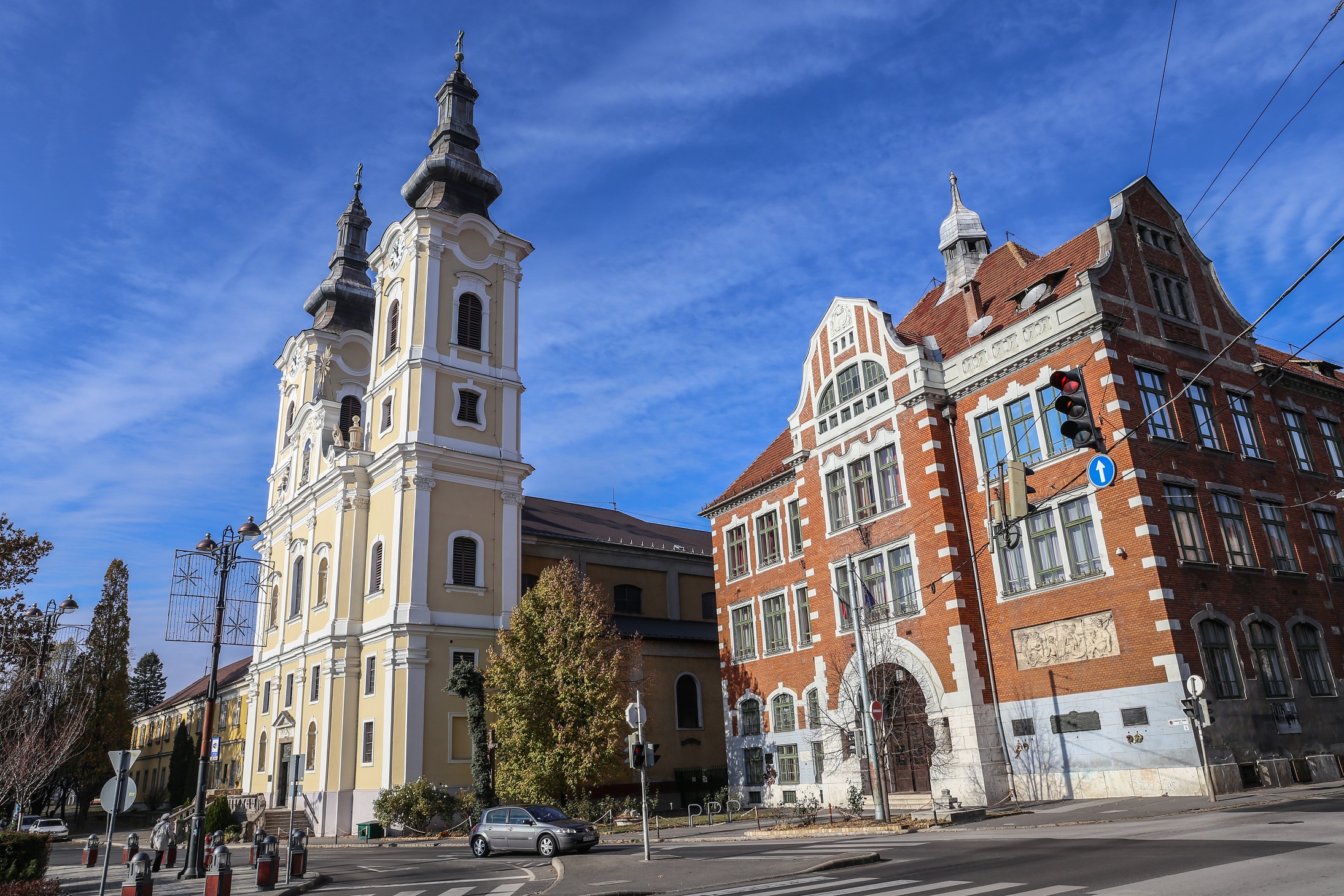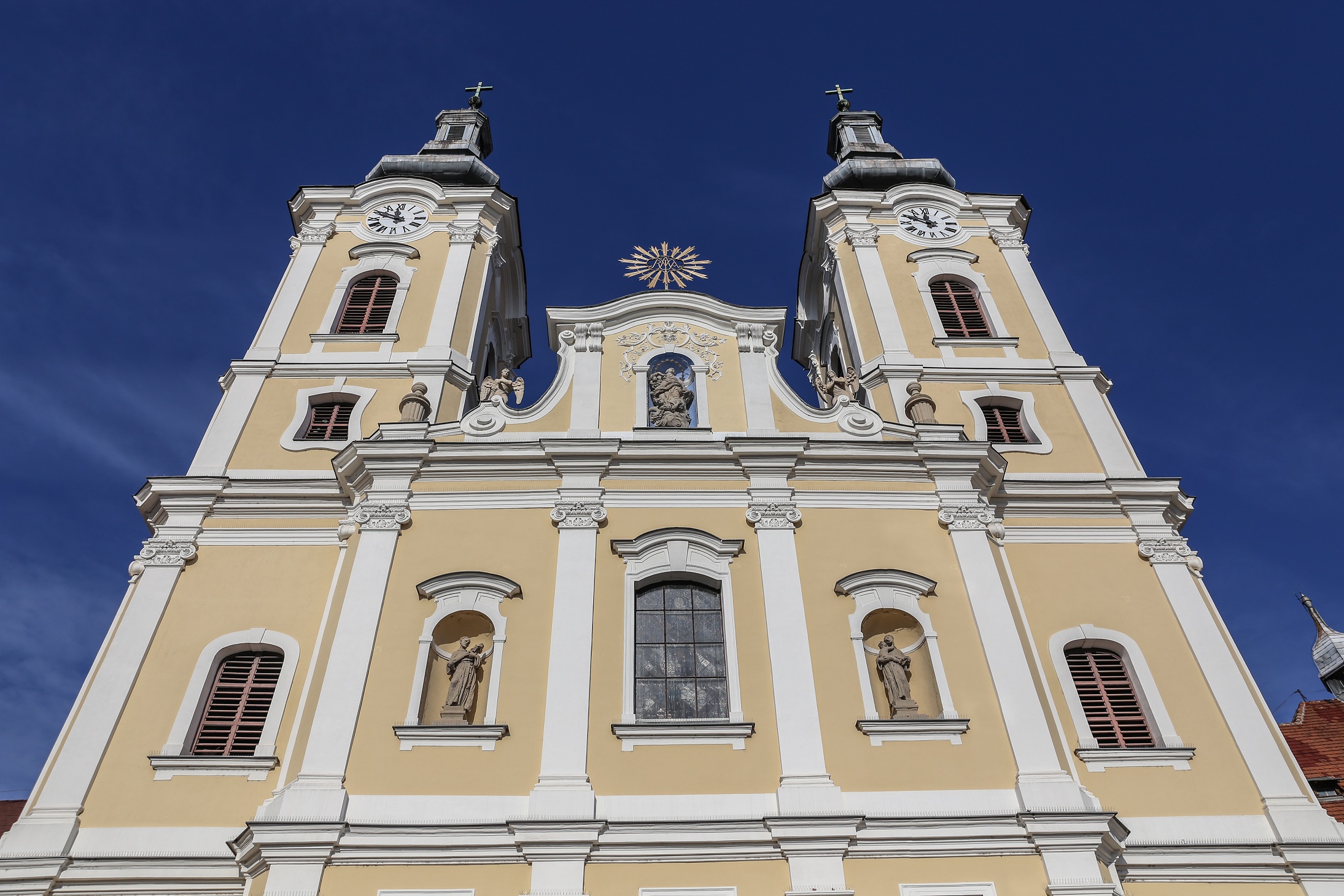 Az épület alapkövét 1729. szeptemberében tették le. Építése 1743-ban fejeződött be az Almássy és Fáy családok adományozásából. Az 1843. július 19-i tűzben leégett a monostor tetőzete, megolvadtak a harangok, a boltozatok megrokkantak. 1845-re az eredetiek mintájára újjászülettek a tornyok, megerősítették a boltozatokat, helyreállították a homlokzatokat és a tetőzetet.
