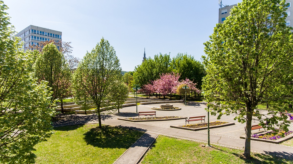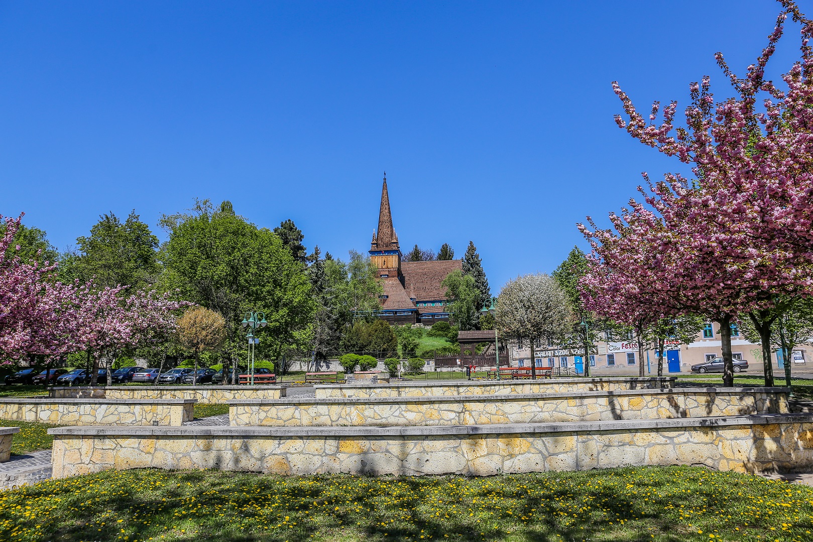 A tér szélén fiatal díszcseresznye sort ültettek.