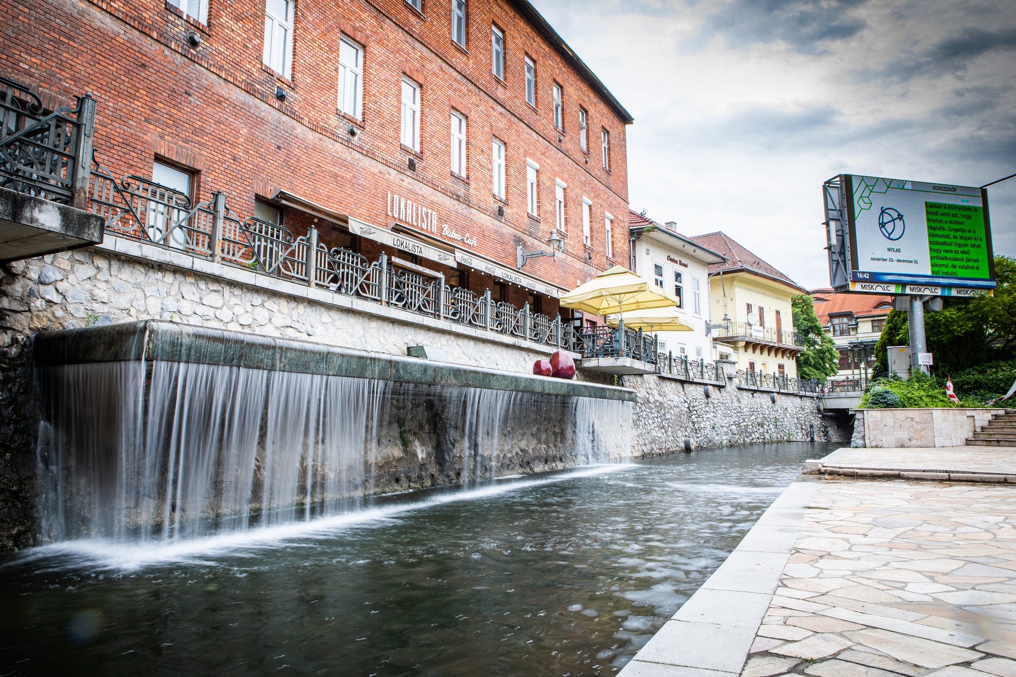 A tér teraszos kialakítású lépcsőin lehet lejutni a patak mesterséges partjához és vízeséséhez, melyet a Szinva megemelt vízszintjével alakítottak ki. A téren áll Kutas László szobrászművész Miskolci lányok szobra, mely kedvelt a fényképezkedők körében.