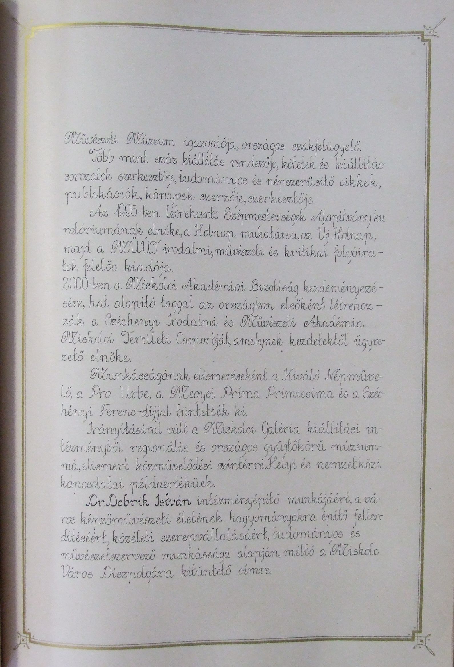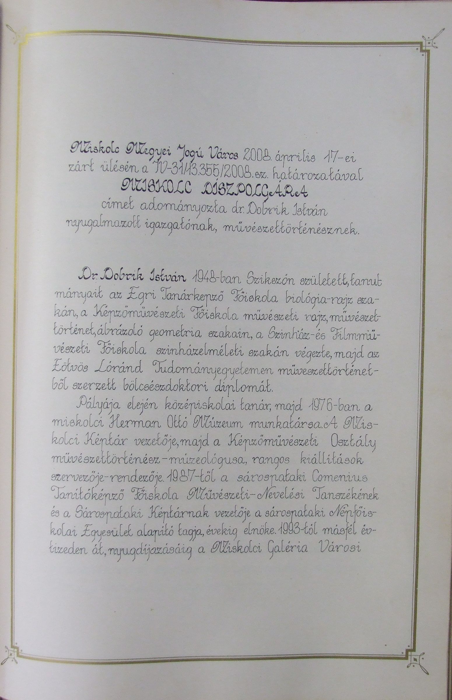 Dr. Dobrik István a város képzőművészeti életének fellendítéséért, közéleti szerepvállalásáért, tudományos munkásságáért, nemzetközi kapcsolatok kialakításáért méltó a Miskolc Város Díszpolgára kitüntető címre.