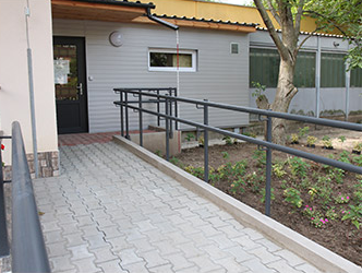 Az akadálymentesség biztosítása érdekében mozgássérült parkoló, bejárati rámpa, akadálymentes WC és színkontrasztos taktilis sávok kerültek kialakításra.