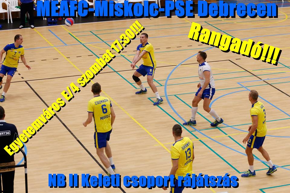 A férfi röplabda NB II Keleti-csoport rájátszásának 2. mérkőzését március 30-án, szombaton rendezik meg a Miskolci Egyetem E/4-es tornatermében. A MEAFC-Miskolc bajnok csapatának ellenfele a PSE Debrecen lesz.A 17.30-kor kezdődő találkozón, melyre a belépés díjtalan, izgalmas és nagy csata várható.
