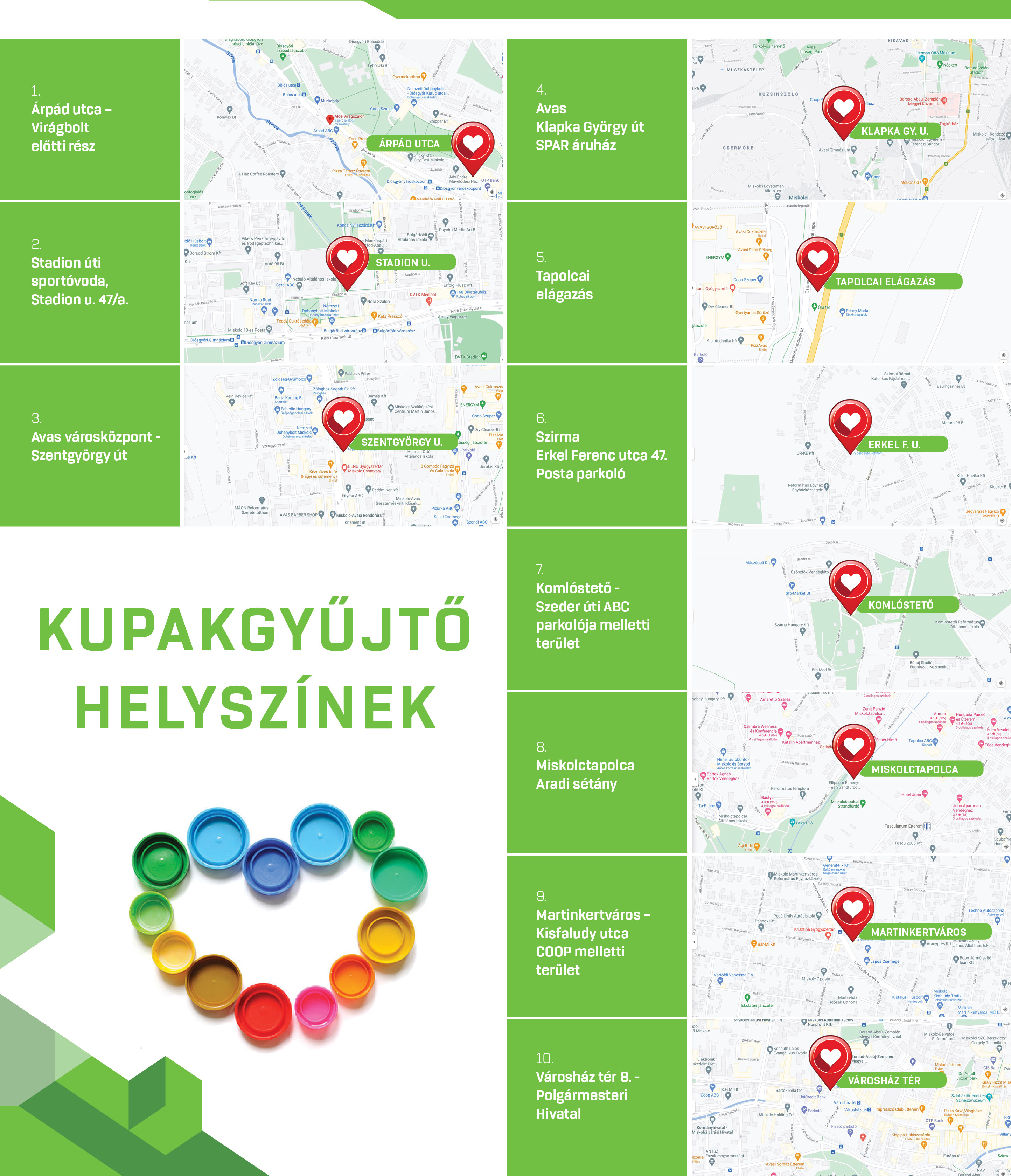 A gyűjtőedényekbe Miskolc kilenc közterületén lehet bedobni a feleslegessé vált kupakokat: az Árpád téren, a Stadion úti óvodánál, a Szentgyörgy utcán, a Klapka utcán, a Tapolcai elágazásnál, az Erkel Ferenc utcán, a Szeder úti ABC parkolójánál, az Aradi sétányon az Ellipsum Élményfürdő mellett, a Martinkertvárosban pedig a Kisfaludy utcai élelmiszerüzlet mellett.
