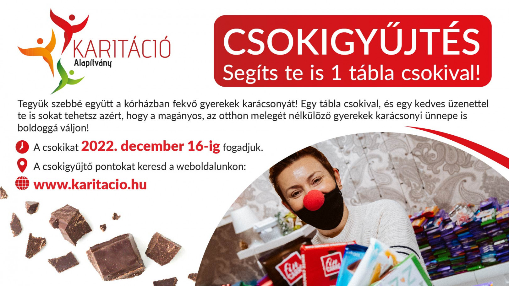 Az előző évben kicsik és nagyok - családok, iskolák, cégek, szervezetek együttesen, ismét mintegy 20.000 csokoládét gyűjtöttek össze és tették sikeressé a Karitáció Alapítvány Bohócdoktorainak jótékonysági csokigyűjtését. Még karácsony előtt a csokoládégyűjtő programsorozatnak köszönhetően több ezer, kórházban gyógyuló gyermek és rászoruló család számára kézbesítettek a bohócdoktorok csokoládécsomagot és tették ezzel örömtelibbé az ünnepeket. 2022-ben újra egy-egy tábla csokival lehet támogatni a Karitáció Alapítvány bohócdoktorainak gyógyítást segítő tevékenységét, hiszen az alapítvány célja változatlan. Idén is több ezer kórházban fekvő gyermek karácsonyi ünnepét szeretné felvidítani csokoládé ajándékozásával. A szervezők örülnének, ha a csoki mellé a felajánló küldene egy bátorító üzenetet, rajzot, verset melyet ők eljuttatnak a kórházakba, a gyermekek. A kicsik pedig erőt meríthetnek a sokszor hónapokon át tartó gyógyulási folyamat során, érezve hogy nincsenek egyedül!