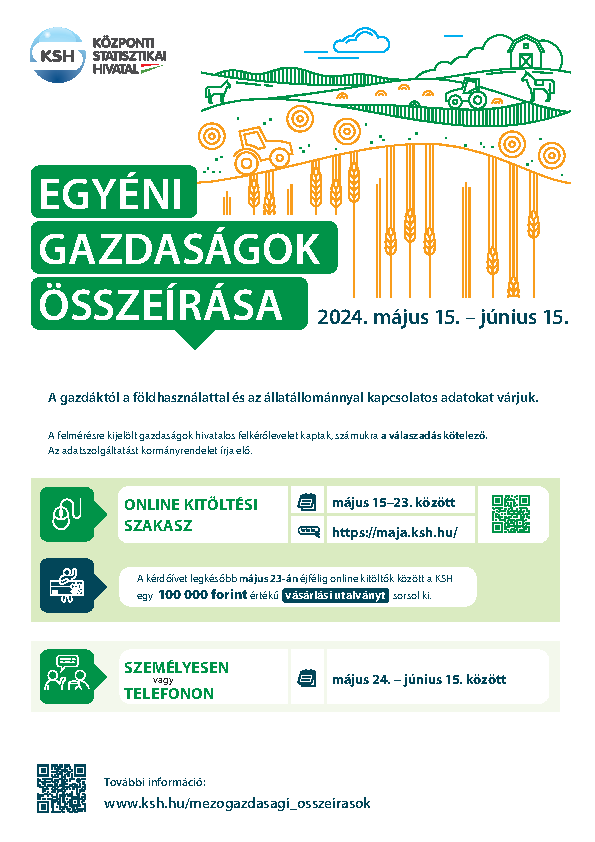 A KSH idén 2024. május 15. és június 15. között végzi az egyéni gazdaságok összeírását. A gazdáktól a földhasználattal és az állatállománnyal kapcsolatos adatokat várják.