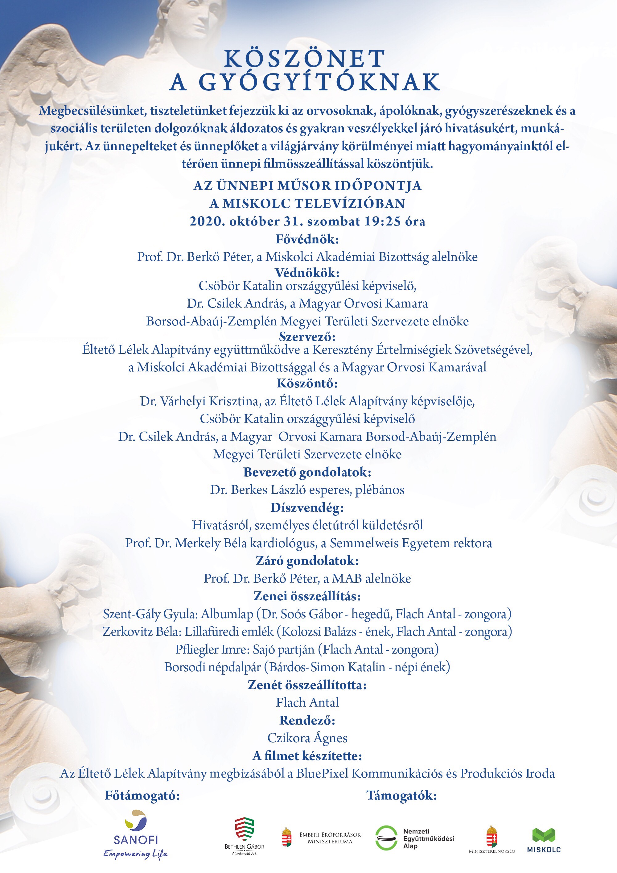 Megbecsülésünket, tiszteletünket fejezzük ki az orvosknak, ápolóknak, gyógyszerészeknek és a szociális területen dolgozóknak áldozatos és gyakran veszélyekkel járó hivatásukért, munkájukért. Az ünnepelteket és ünneplőket a világjárvány körülményei miatt hagyományainktól etlérően ünnepi filmösszeállítással köszöntjük.