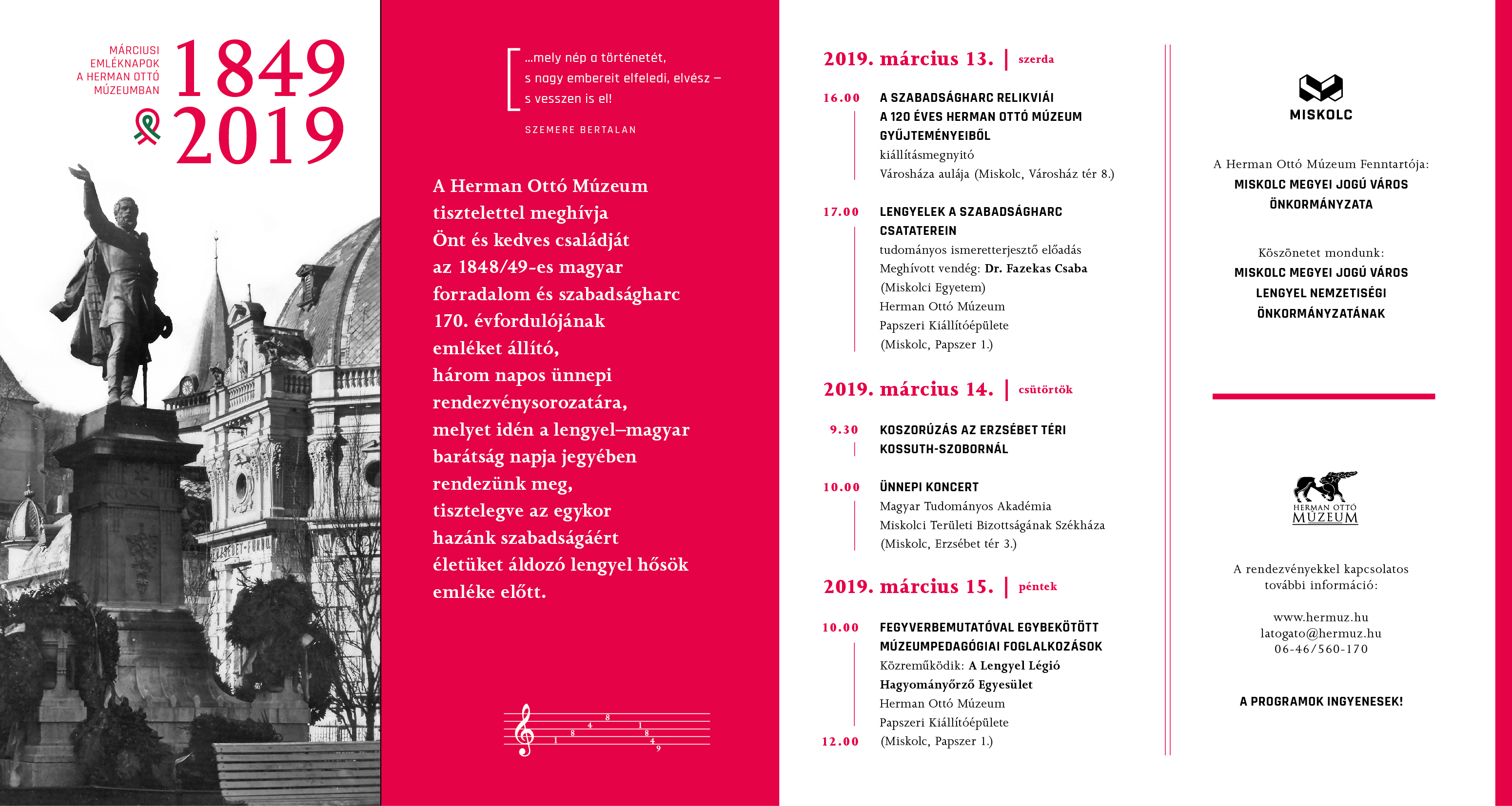 A Herman Ottó Múzeum tisztelettel meghívja Önt és kedves családját a 1848/49-es magyar forradalom és szabadságharc 170. éfvordulójának emléket állító, három napos ünnepi rendezvénysorozatára, amelyet idén a lengyel-magyar barátság napja jegyében rezndez meg, tisztelegve az egykor hazánk szabadságáért életüket áldozó lengyel hősök emléke előtt