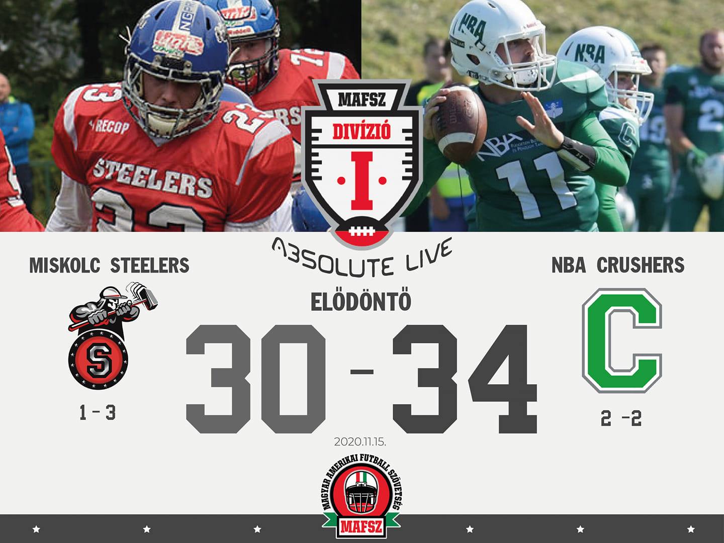A magyar amerikaifutball-bajnokság 2020-as Divízió 1-es idényének november 15-i, vasárnapi elődöntőjét Diósdon rendezték meg. A Miskolc Steelers jó játékkal megnyerte az első három negyedet, ám a befejező játékrészben a szombathelyiek érvényesíteni tudták akaratukat és nyertek.