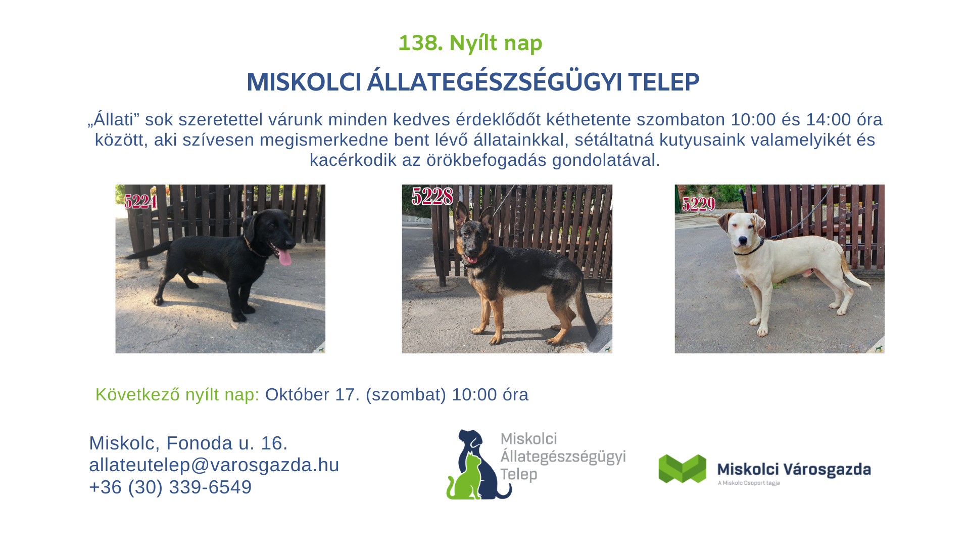 138. alkalommal tartjuk meg nyílt napunkat 2020. október 17-én szombaton, 10:00 és 14:00 óra között a Fonoda u. 16. szám alatti Miskolci Állategészségügyi Telepen.