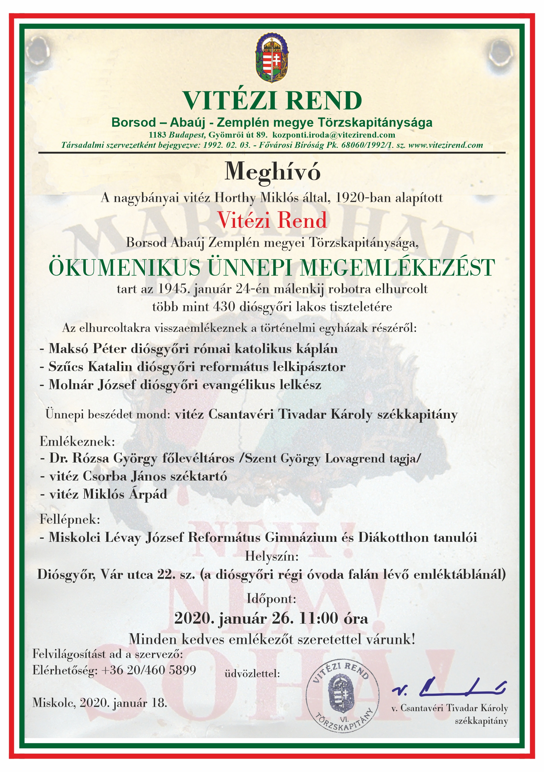 A nagybányai vitéz Horthy Miklós által 1920-ban alapított Vitézi Rend B.A.Z Megyei Törzskapitánysága Ökumenikus Ünnepi Megemlékezést tart, az 1945. január 24-én „málenkij robotra” elhurcolt több mint 430 diósgyőri lakos tiszteletére.
