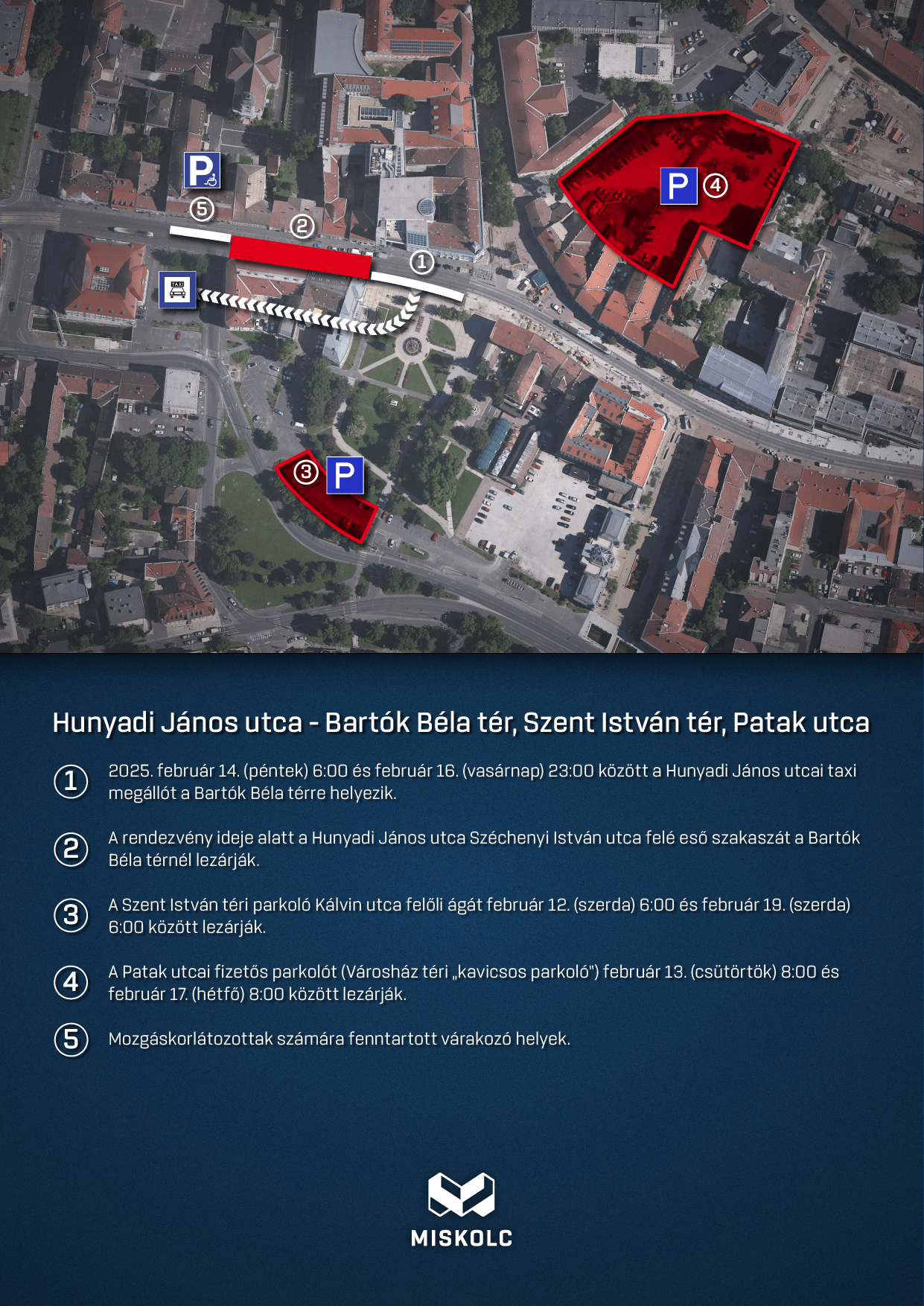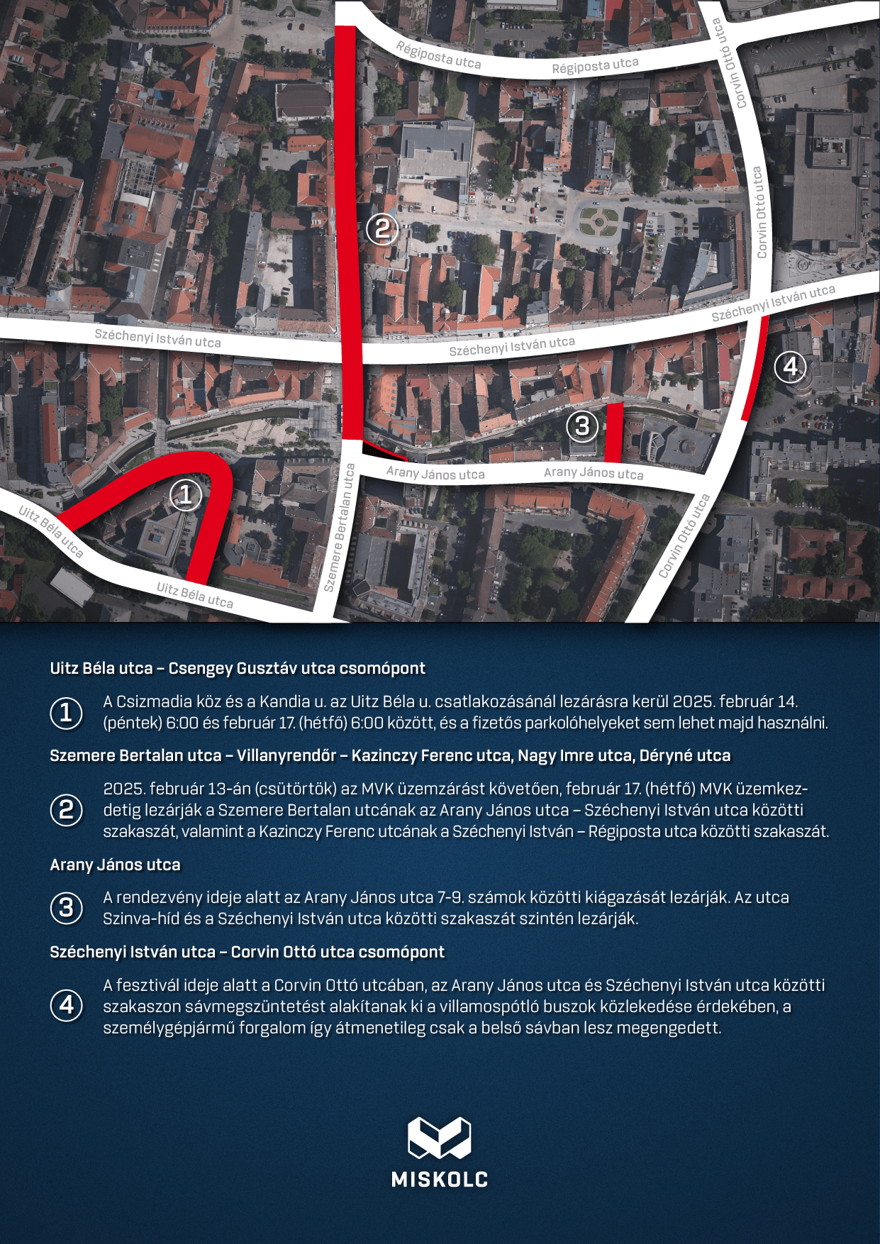 A 2025. február 14. és 16. között rendezett Kocsonyafesztiál miatt, Miskolcon több helyen forgalomkorlátozás és ideiglenes forgalmi rend lép majd életbe, ami a városban való parkolást is érinti. Az ideiglenes forgalmi rend bevezetése a Miskolci Városgazda Nonprofit Kft., a Miskolci Önkormányzati Rendészet, a MiRend-Sec kft. valamint a Miskolci Rendőrkapitányság közreműködésével valósul meg.