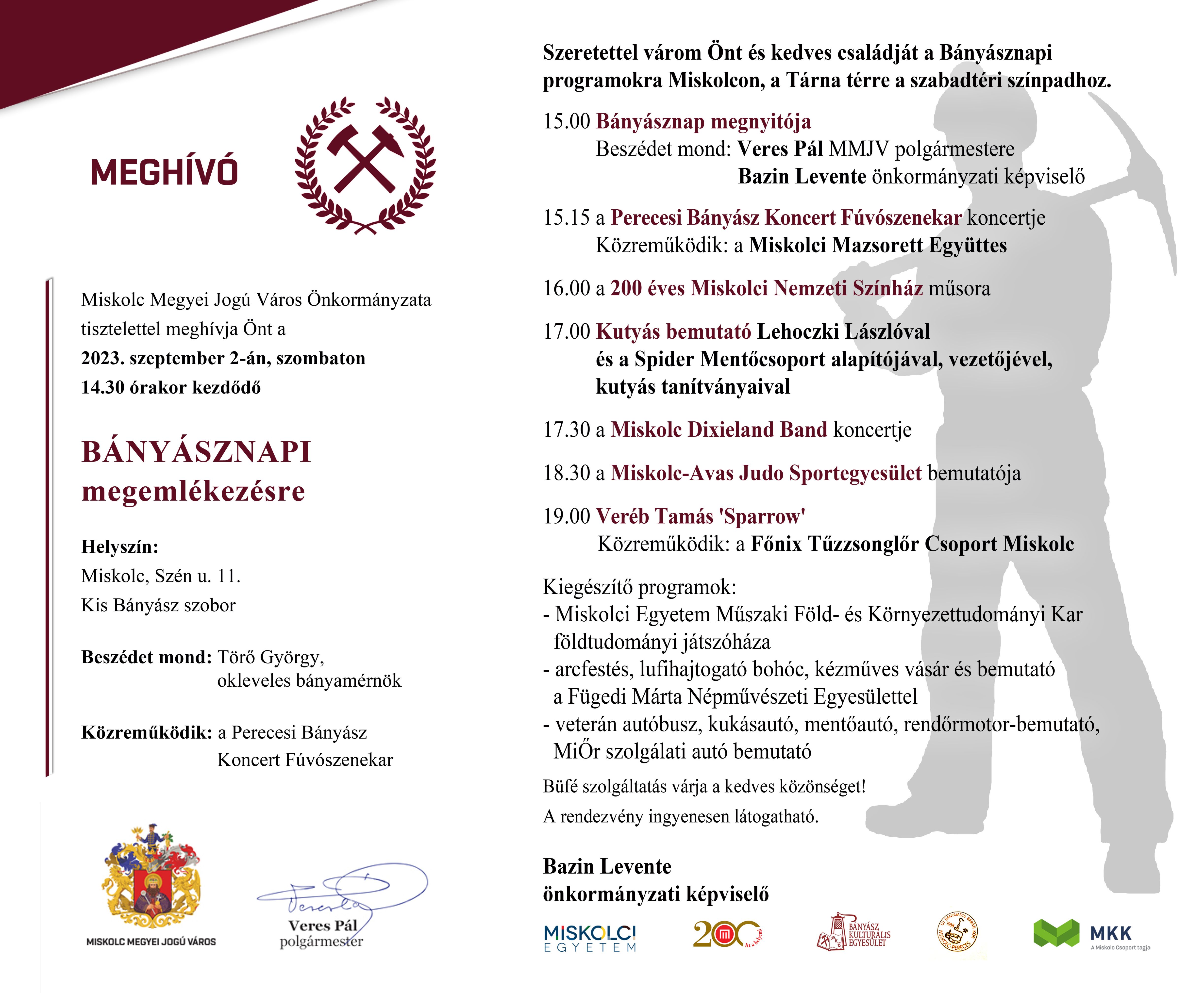 14:30-kor a Kis Bányász szobornál Törő György okleveles bányamérnök mond beszédet, majd a programok a Tárna téren, a szabadtéri színpadon a folytatódnak.