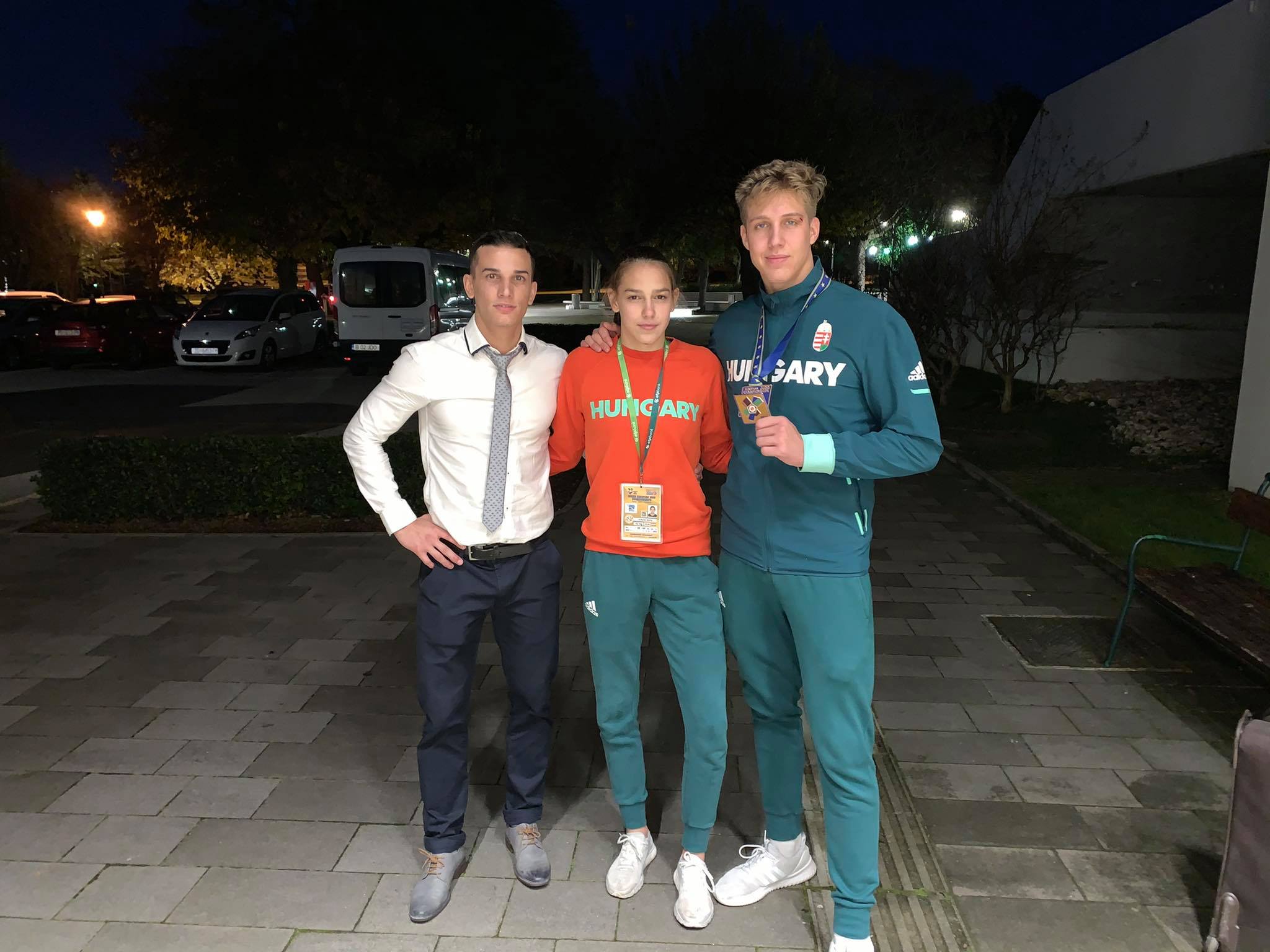 Bartha Ákos edző (balról), Kriza Anna és Sáfrány Péter Porec városában, a junior judo Eb-n.