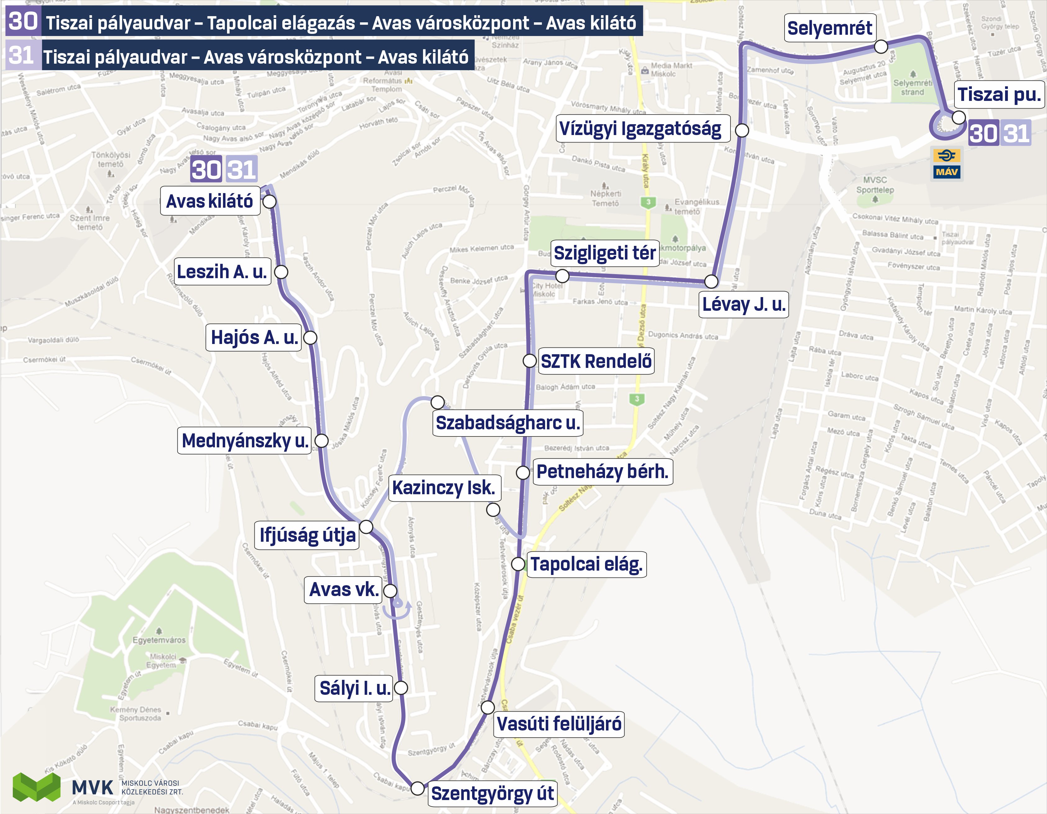 - 30-as viszonylat, amely a 31-es autóbusszal párhuzamosan a Tiszai pályaudvar és az Avas kilátó között közlekedik azzal a különbséggel, hogy a 30-as járat a Szentgyörgy úton és az Avas városközponton át közlekedik az Avas kilátó végállomásig. A 30-as autóbusz menetrendjében csillaggal jelölt járatok a Tiszai pályaudvar végállomás után továbbközlekednek a Szondi György utca végállomásig az Üteg utca megállóhely érintésével. A 30-as autóbusz az Avas kilátó végállomáson a 29-es busz indulóhelyéről indul.