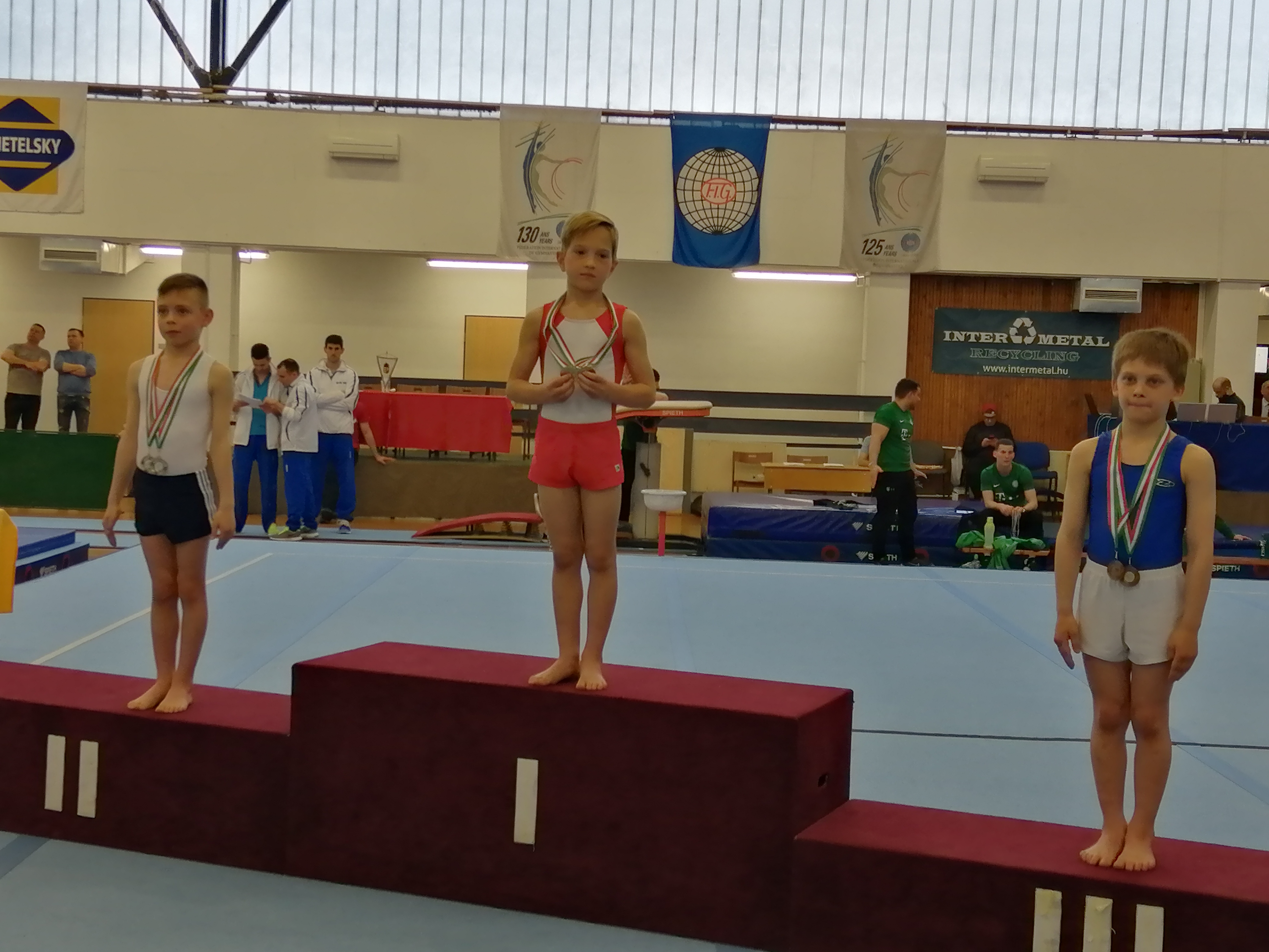 A gyermek fiú kezdő egyéni összetett győztese, Győri András a dobogó tetején.