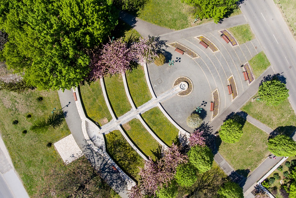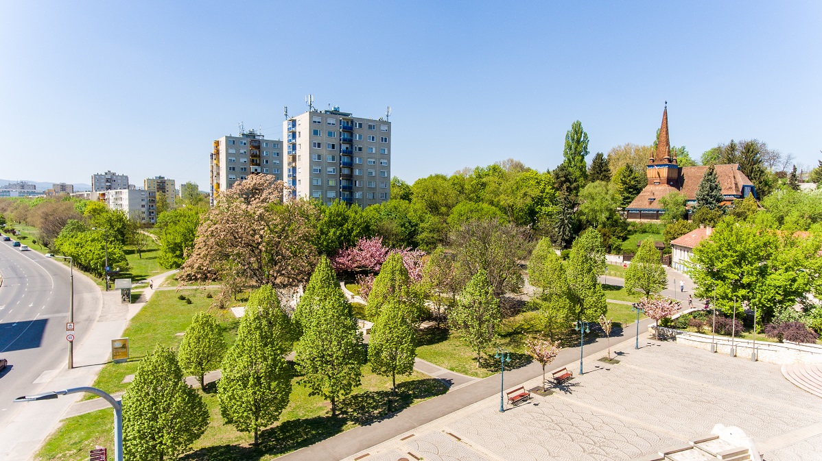 A tér szélén fiatal díszcseresznye sort ültettek.