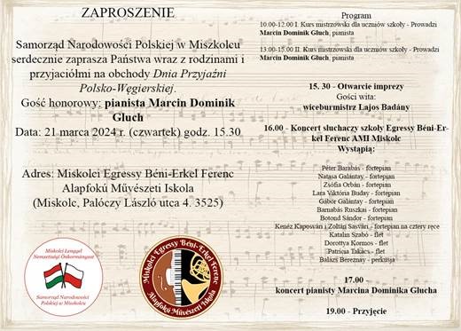 A Miskolci Lengyel Nemzetiségi Önkormányzata nevében sok szeretettel meghívom Önt a Lengyel-Magyar Barátság napja alkalmából megrendezésre kerülő rendezvényünkre.