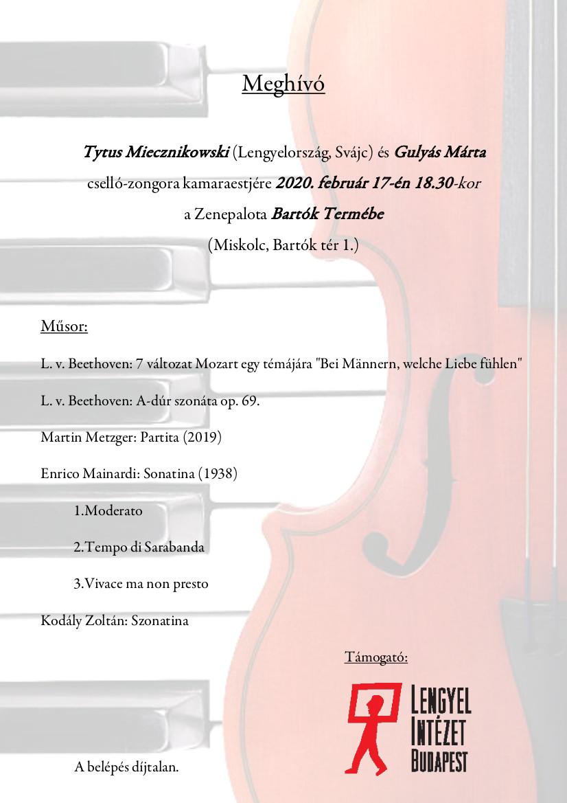Meghívó - Tytus Miecznikowski és Gulyás Márta cselló-zongora kamaraestjére - Zenepalota Bartók Terme, 2020.02.17.
