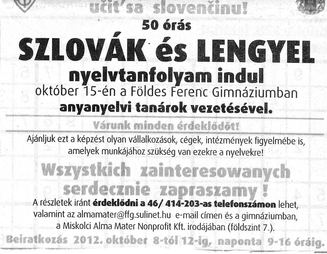 50 órás szlovák és lengyel nyelvtanfolyam indul október 15-én a Földes Ferenc Gimnáziumban, anyanyelvi tanárok vezetésével.
